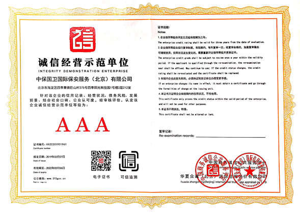 中保國衛(wèi)國際保安服務(wù)(北京)有限公司,屬中保國衛(wèi)集團旗下子公司。能全方位的為大型客戶提供優(yōu)質(zhì)的安保、押運服務(wù),是集人防和技防于一體的新型正規(guī)化綜合安保押運服務(wù)企業(yè),提供人防、物防、技防、聯(lián)網(wǎng)報*、非武裝押運等安防相關(guān)的一站式服務(wù)。 公司在國內(nèi)多省設(shè)立有分公司及分支機構(gòu),著重提升安全押運、智能技術(shù)押運及安全技術(shù)防范相關(guān)的服務(wù),業(yè)務(wù)范圍覆蓋全國一、二線城市、港澳地區(qū)以及海外地區(qū)。安保方面主要為政府機構(gòu)、金融機構(gòu)、企事業(yè)單位、醫(yī)療衛(wèi)生、高等院校、工業(yè)園區(qū)、大型商場、高檔住宅、智能商務(wù)樓、大型活動提供門衛(wèi)、守護、巡邏、押運(非武裝)、安全檢查、保安特勤、私人護衛(wèi)、消防中控、安全技術(shù)防范、遠洋護航等全方位服務(wù),同時面向國際市場,為中資企業(yè)在“一帶一路”沿線國家投資提供境外安保服務(wù)。 >> 更多內(nèi)容 |
